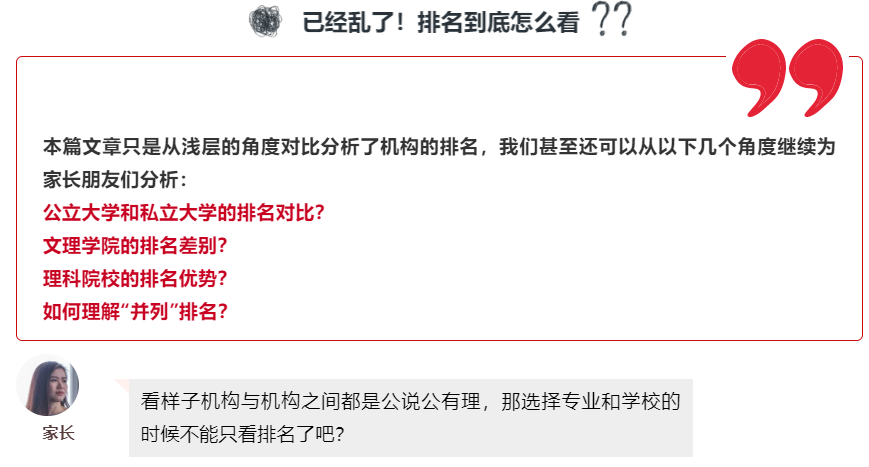 非常正确!机构给出的排名只能起到小小的参考作用,再给家长和学生建议学校时,还有很多其他因素需要参考,比如院校种类,地理位置及周边环境,提供专业种类,毕业发展等一些列复杂的因素。
