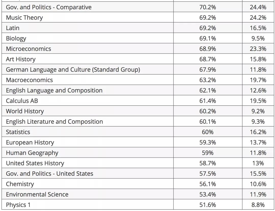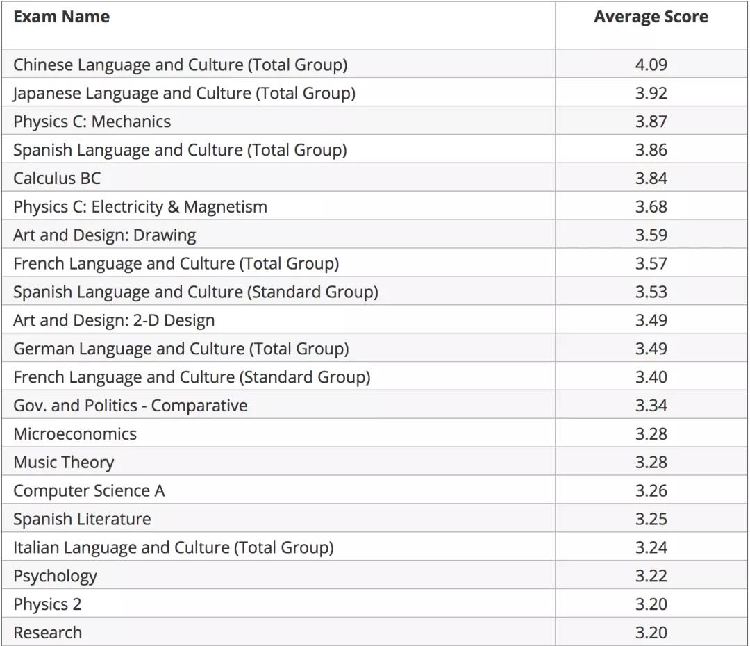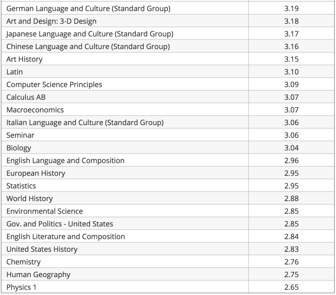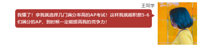 这依旧是不科学的AP规划。这里其实需要各位注意的是,平均分数高并不代表简单。很多语言类AP出现高平均分是因为很多其母语或有海外生活经验的学生倾向于此类AP语言考试以获取满分,想象一下作为华人学生的你,拥有一门满分的中文AP能给大学招生官带来多少说服力呢?