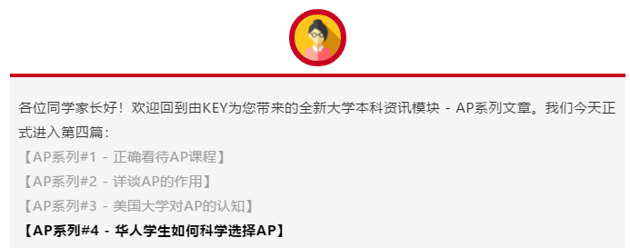 KEY建议我们华人学生们在选择AP课程的时候不要带有从众心理,更不要为了拿高分而选择一些“毫无意义”的AP课程或考试。学生们应该结合自身的学术兴趣,未来专业选择,以及课程特色等方面来选择合适的AP课程。每个学生都有其特长特点,只有在了解他以后才能初步给出最科学的AP考试的“排兵布阵”。KEY在特意为一直关注我们【AP系列文章】的家长和学生们准备了一次免费咨询的机会,KEY的专家团队将会给出孩子未来大学规划初步走向,为您指引升学方向。快扫描下方二维码或“点击链接”预约吧。