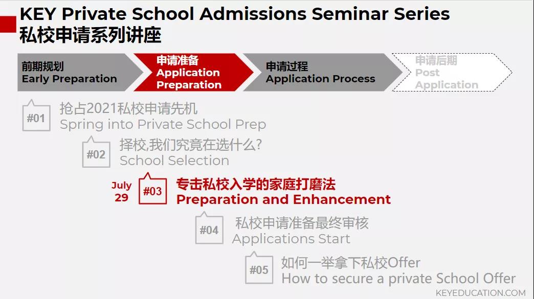 而为了帮助家庭能够奠基正确且最新的私校申请信息,KEY依照近十年来的私校申请经验,将复杂的申请环节拆解,打造出了一系列共五场的私校申请系列讲座, 深入分析每个环节家长所需注意的误区,就是为了手把手的带领家长,在每一个阶段做好最佳的准备。