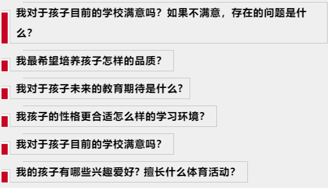 申请的下一步就是决定目标学校,许多望子成龙的家长们在这个阶段最关注的一般是哪个学校的排名高?名气大?升学率高?进而为孩子挑选一所“最好的”私校。在这里,KEY温馨提醒您,排名高的学校不一定是“最好的”学校,更不一定适合您的家庭。您在择校的时候,需要先考虑的问题并不是“哪所学校最好?,而应该是自己家庭的教育“需要”什么,从而挑选最为与您家庭最为匹配的学校。因此,KEY建议家长们在挑选学校之前,不妨先问问自己这些问题: