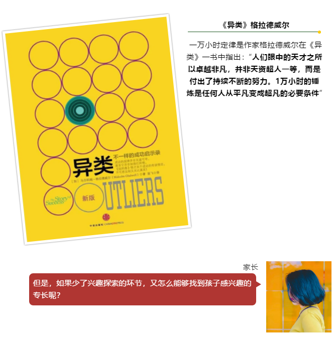 每个专长都需要花费的一定的时间与精力来培养,经过特定的时间达到一定的程度后,孩子才会意识到自己有这方面的天赋或热忱,并想要持续提升。也就是所谓的”一万小时定律”