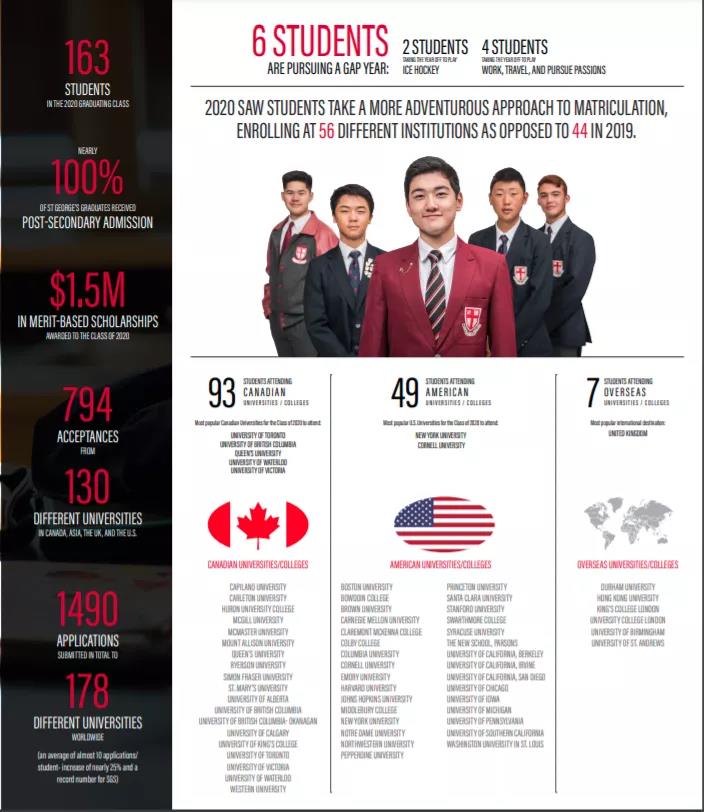 相对而言,私立学校又有“大学预备学校”之称,教学目的更加单一明确,就是帮助学生未来能顺利进入更高级的学府就读。因此私校提供了高强度的学术课程,并通过入学筛选确保大部队学生水平在一定基础之上,可以跟上紧凑课程安排进度。如下图所示,在私校每年公布的年终报告中,大多数学生最终都进入了大学,同时,除了毕业去向外,部分学校还会公布学生的奖学金获得比率,AP考试均分等,充分体现出校方对学生升学的重视。