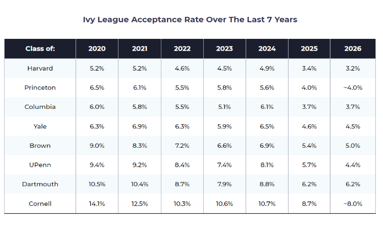 然而,申请人数的增长势必意味着录取竞争的白热化,与庞大的申请人数相对的则是各大名校持续走低的录取率,我们特别为家长们整理了美国藤校过去7年的录取率对比。