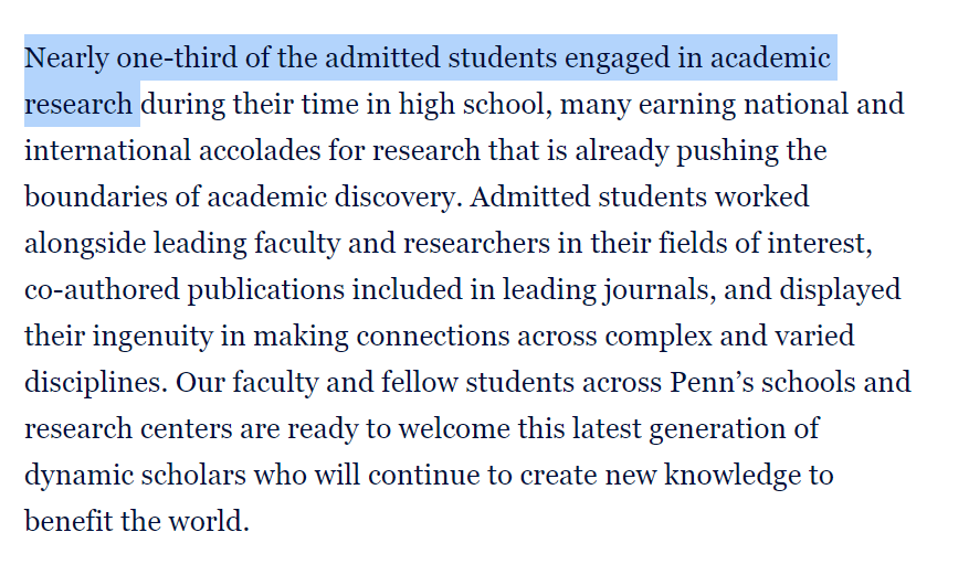 在今年被宾大录取的学生中,近三分之一都在高中期间参与了学术研究。其中一些学生还取得了亮眼的成就,他们与兴趣领域的教师和研究人员一起工作,共同撰写了发表在领先期刊上的出版物。还有些学生的研究赢得了国内或是国际范围内的赞誉。