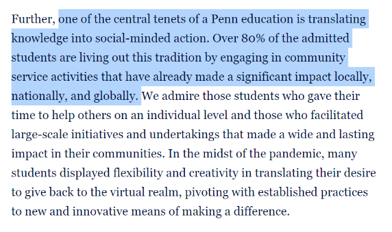 宾大教育的核心原则之一是将知识转化为具有社会意识的行动,对当地、全国乃至全球都产生重要的影响。因此学校也会重视那些有社区服务经历的学生。今年超过80%的被录取学生参与了社区服务。尤其是在新冠疫情中,学生们显示了自己的创造性,用线上或者线下的方式来为这个受到疫情困扰的世界做出贡献。
