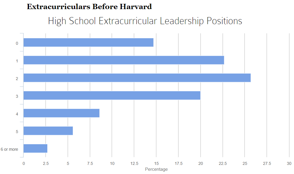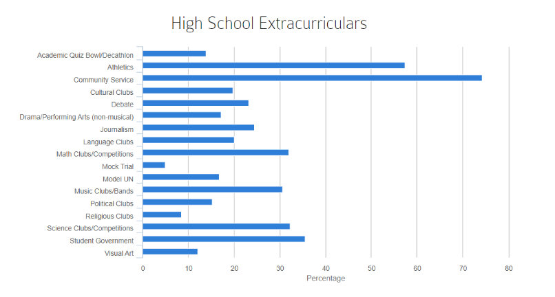 哈佛大学的学生对于体育和公益非常重视,据统计,74%的学生参与了社区服务;其次,是体育运动,参加学生人数占57%;剩下的分别是,学生会占36%,数学俱乐部占32%,科学俱乐部占32%,音乐团体占31%。除此以外,学生参与的高中课外活动还包括新闻记者、辩论社、戏剧表演、模拟联合国等。