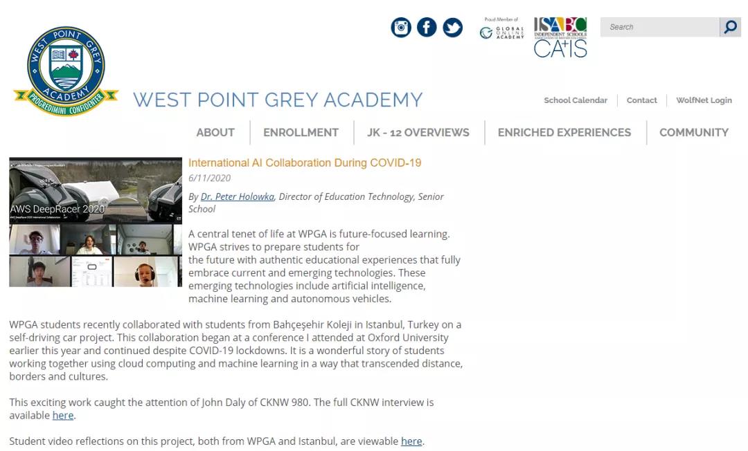 WPGA致力于通过结合当前的新兴技术给学生提供最先进的学习体验,为瞬息万变的未来做好最佳的准备。而尽管在居家防疫期间,学习受到了阻碍,WPGA学生与土耳其伊斯坦堡的Bahçeşehir Koleji学生进行了一个AI自动驾驶汽车的项目,学生们在家里通过云端系统和机器学习来跨越距离、国界和文化的精彩合作故事,想了解更多请见WPGA官网。