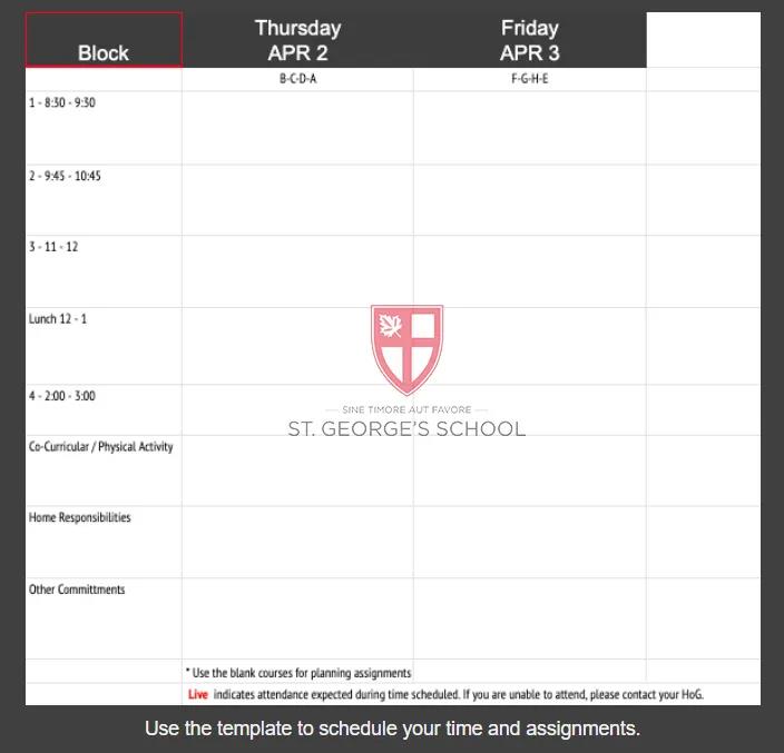 St. George’s School,早在4月1日就公告出了网课学习准则,除了基本的参与课程指南之外,并提供了统一模板的时程表,要求学生主动地填入课堂的讯息以及所需准备事项,来确保学生能够保持规律作息按表操课。除此之外,为了确保每一位学生都能跟上大部队的学习效率,St. George’s School更提供了每日一小时的1对1补强教学时间,提供学生额外之支持。