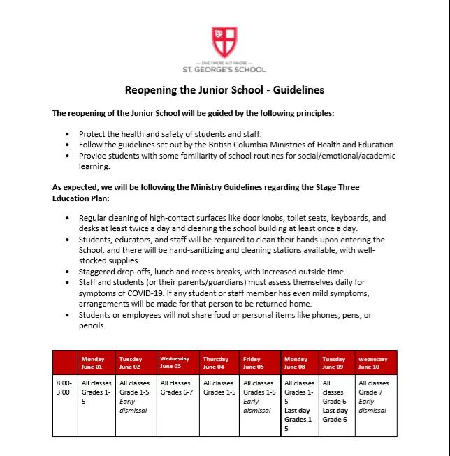 为了能够正式的重新开学,每间学校也都正在努力拟定”安全营运计划”确保在开学后可以是当的疏散人流,让学生可以在健康不受威胁之下持续学习,而大温地区的私校如St. George’s School也在5月15日省长宣布校园开放后,随即宣布了校园重启声明并且在官网上放上了详细的校园重启计划书,私校的反应速度实在令人敬佩,有兴趣了解更多的家长也欢迎到St. George’s School的官方网站查看更多资讯。