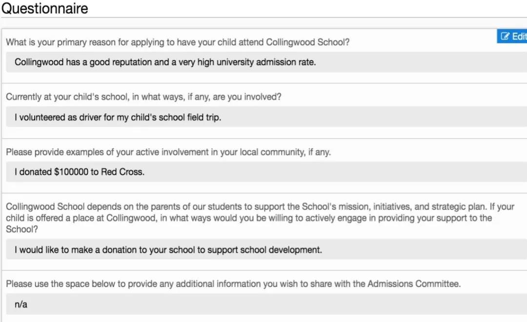 该图是知名私校Collingwood申请书内的其中一个环节,有些初次申请搞不清楚状况的家长,还以为这些提问只是”简答题”,眼看申请截止日要到了,于是马虎回答了几句话,就递交了申请。可想而知这样的申请书绝对是让招生官过目即忘的。