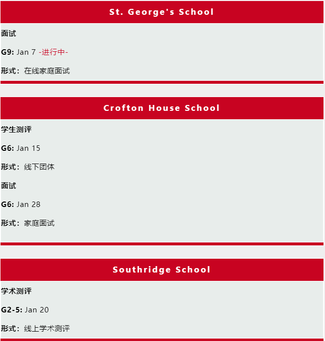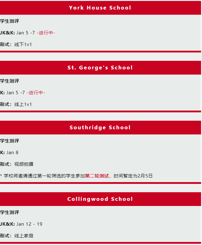 对于中高年级的申请者而言,目前也有私校已经开始发布针对招生年的测评与面试邀请,与低龄申请者不同,部分私校会先进行一次学术测评,考察学生的硬实力,而通过筛选的学生才会收到团体测评的邀请。同时,更多的年级的邀请将在1月后发布。