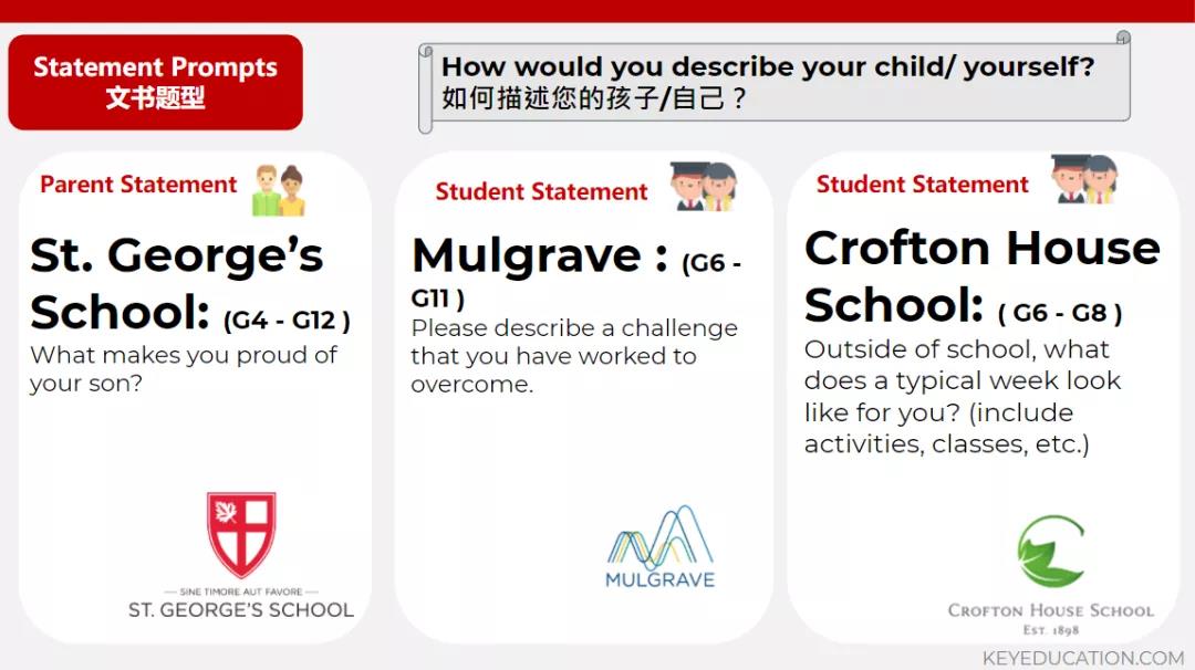 以上是今年各大私校的申请文书题型,如St. George’s School的题目:「是什么让你为你的儿子感到骄傲的?」,这类的问题属于开放式问题,家长的回答也没有所谓的对与错,然而要知道每一个私校文书的题型的背后都有着招生官的巧思在里头,例如在描述您孩子的这类文书题型中,学校想要知道的是您孩子与他人与众不同的地方。能否成功给招生官留下深刻印象要点就在于你是否抓准了文书的回答方向?