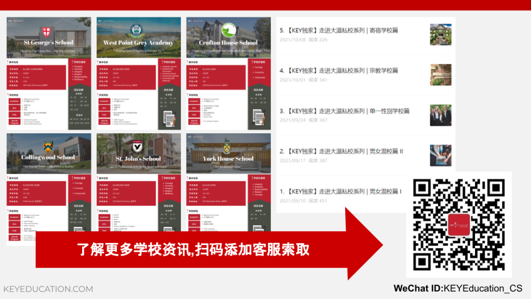 另一方面,在过去的两周中,为了更好的帮助家长们了解本地学校的详细情报,从而找到适合自己家庭的选项,KEY还特别针对0-7岁&8-13岁的申请家庭举办了择校专场讲座,遗憾错过的家长可以扫描二维码联系我们的客服人员索取讲座的回顾文章和大温私校介绍系列内容。