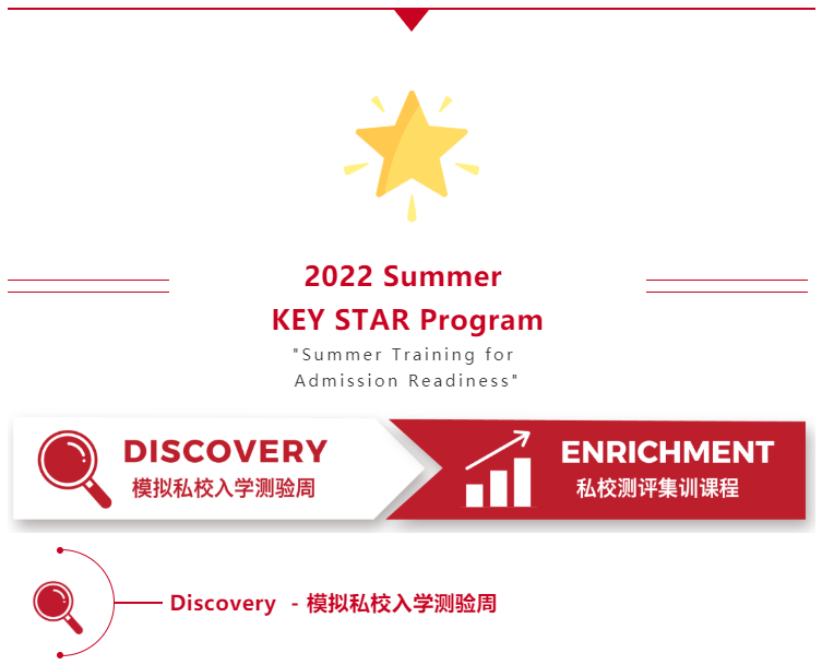 我们非常理解家庭在首次面对私校测评时的迷茫,为了帮助家长们准确掌握孩子目前能力水平,充分了解私校对学生的关键考察点,从而最大化利用剩余的时光做好针对性的准备,KEY特别设计了 Summer STAR Progam, 包含Discovery 与 Enrichment 两个环节。