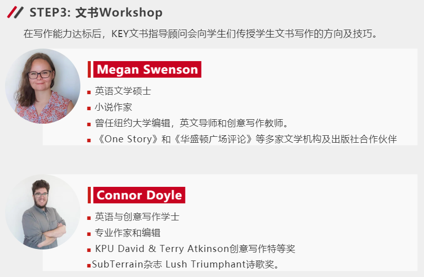 优秀的写作能力是完成高质量文书的基础。在KEY,我们会根据学生在入学评测中的表现,安排他们参加符合当前能力水平的沉浸式英语课程(Immersive English) 或基础/进阶写作课程(Foundation/Advanced Writing),进行有针对性的提升,确保他们拥有撰写合格文书的能力。