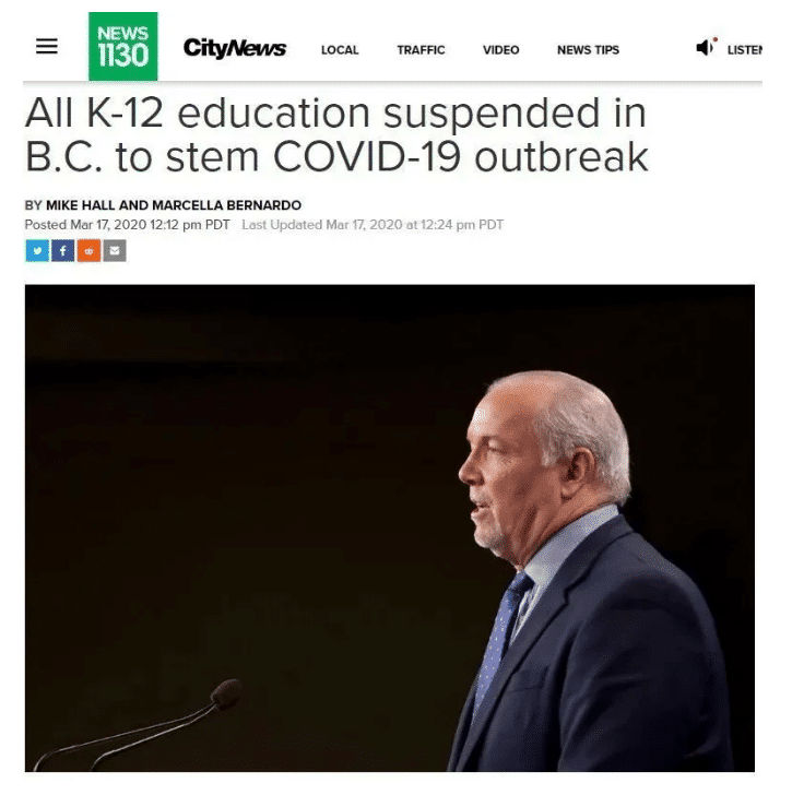 隨著新型冠狀病毒疫情的蔓延,在三月十七日BC省長John Horgan宣布進入緊急狀態,將無期限的暫停幼兒園到12年級的課程。而至今春假已經結束了但復課仍然遙遙無期。
