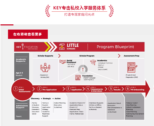 KEY教育专家负责发展私校所注重的三大综合能力(英语能力、学术能力、社交能力),为即将来临的私校入学测评做好最佳的预备。同时通过孩子在课堂中的表现回馈给申请顾问,帮助顾问在制定家庭档案发展策略进行全面的汇整,并在执行时可以有根据性的告诉家长下一步的方向与要点,时时刻刻把关孩子与家庭的申请档案发展进度,保持着调整的弹性再有必要的时候介入,重新聚焦当下首重的任务,以确保打造出每一份绝佳的申请档案。