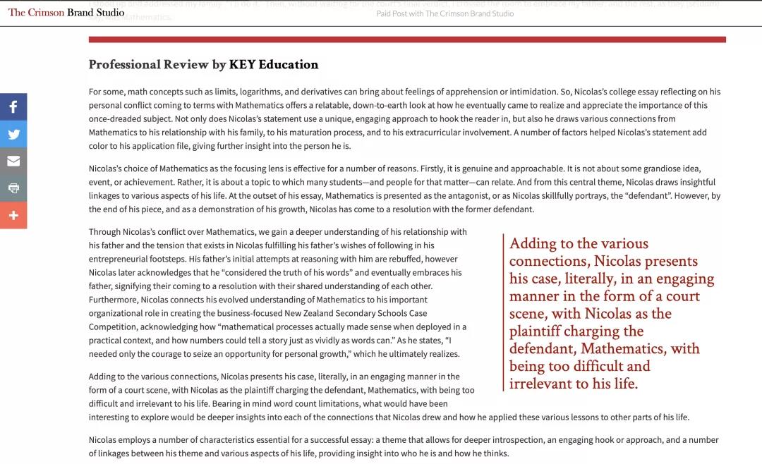 今年,KEY还收到了The Harvard Crimson – 哈佛大学官方校报的特别邀请,点评哈佛大学2021 TOP 10 录取文书中来自华裔申请人的一篇。