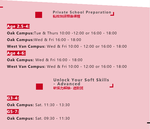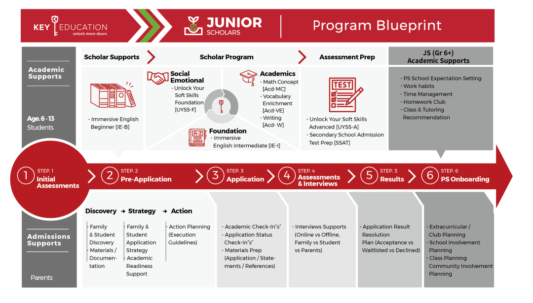 KEY教育部门专家在大温知名私校任教多年,也曾作为测评老师对学生进行评测,充分了解私校考察申请者的关键。凭借丰富的经验,加上多年来累积的私校面试与团体测评数据库, 我们开发出一套专击私校入学的完善课程体系。首先,学生会参加入学评测,由教师团队对其进行全方位的评估,当学生初次来到KEY时会参加入学测评(Initial Assessment),专家老师会依照测评的结果做分析并给予下一阶段补强的建议,并安排学生进入符合其当前能力水平的班级,进行针对性地进行培训。