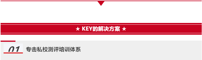 然而,真正有效的培训是需要提前准备的。尤其是团体测评所考察的“软实力”,不像英语、数学一样可以通过短时间大量练习强化提高分数,而是需要长期的培养和针对性的训练才能养成的。在考前才临时抱佛脚的学生,很难在有限的时间内,真正消化和理解培训中的关键要点。所以,有心的家长们现在就应该着手准备起来了。为了更好的帮助学生备战团体评测,KEY根据多年经验,特别设计了一套针对私校团体评测的解决方案。