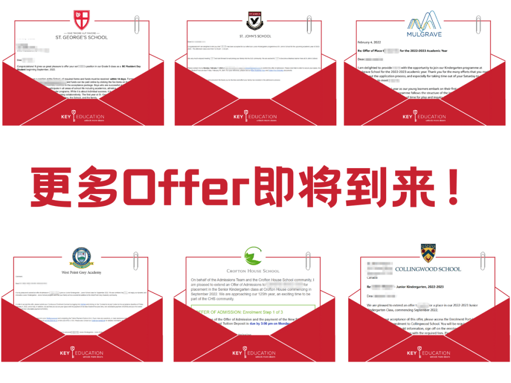 眼下,部分私校已经开始发放针对低龄段申请人的Offer,KEY也陆续收到家庭成功获得WPGA, St.George’s, Collingwood, Crofton House等热门私校录取的好消息,具体的offer数量我们将在统计后向大家公布!恭喜各位成功收到offer的家长,长久以来的努力终于收获了理想的结果。还在等待名单里的家庭也不用着急,接下来私校会依照空缺继续放出offer。