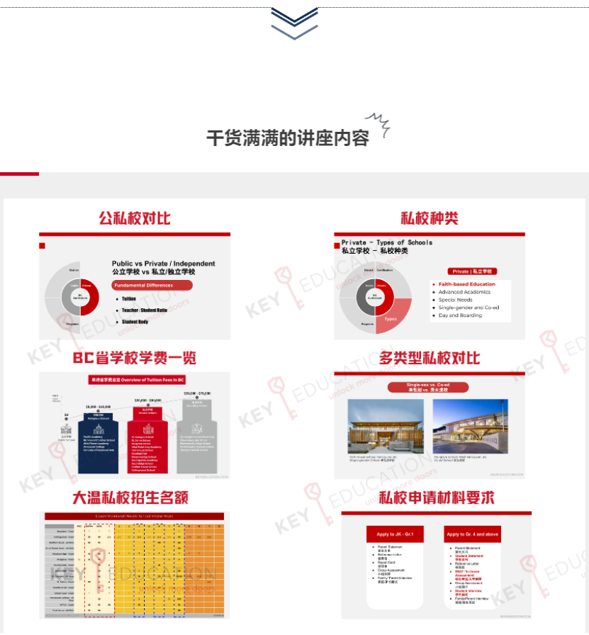 为了帮助家长们更全面的了解择校有关的信息,Ben还深入探讨了“公私校对比”、“BC省私校的种类与特点”、“BC省学校学费”、“私校招生名额”、“申请材料要求”等家长们所关注的关键知识点,进而帮助家长们明确自身的教育需求,挑选最适合自己的学校。
